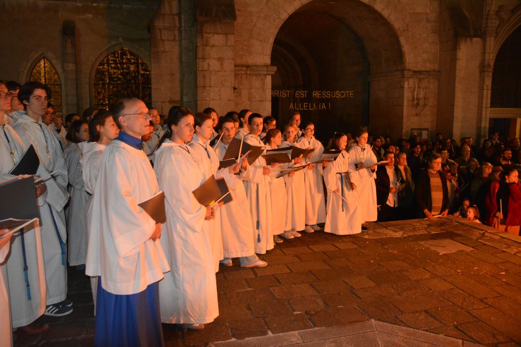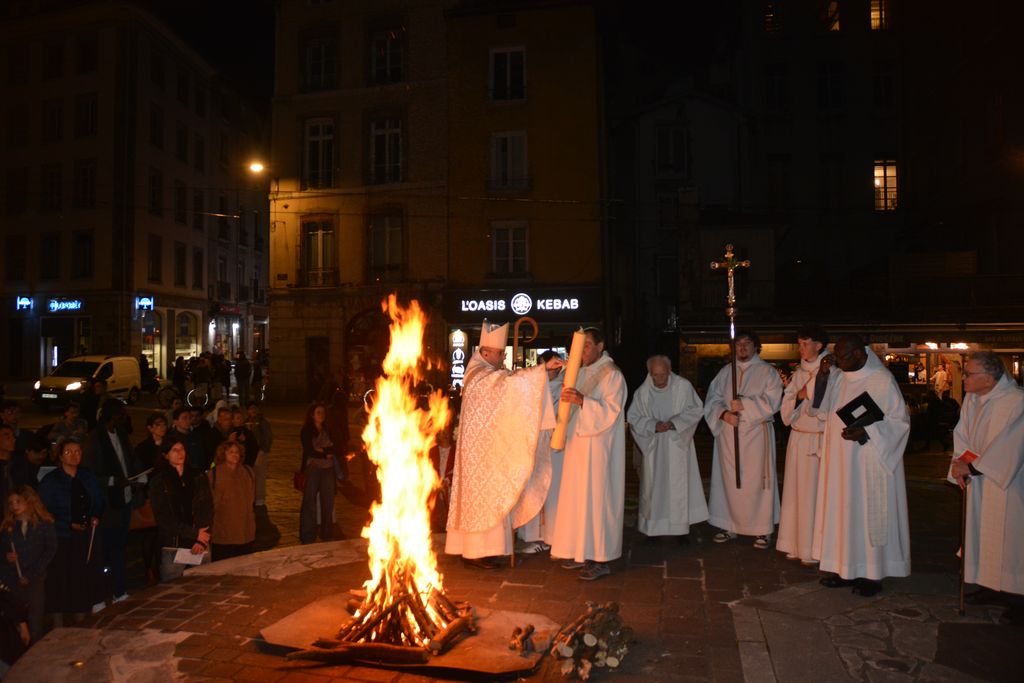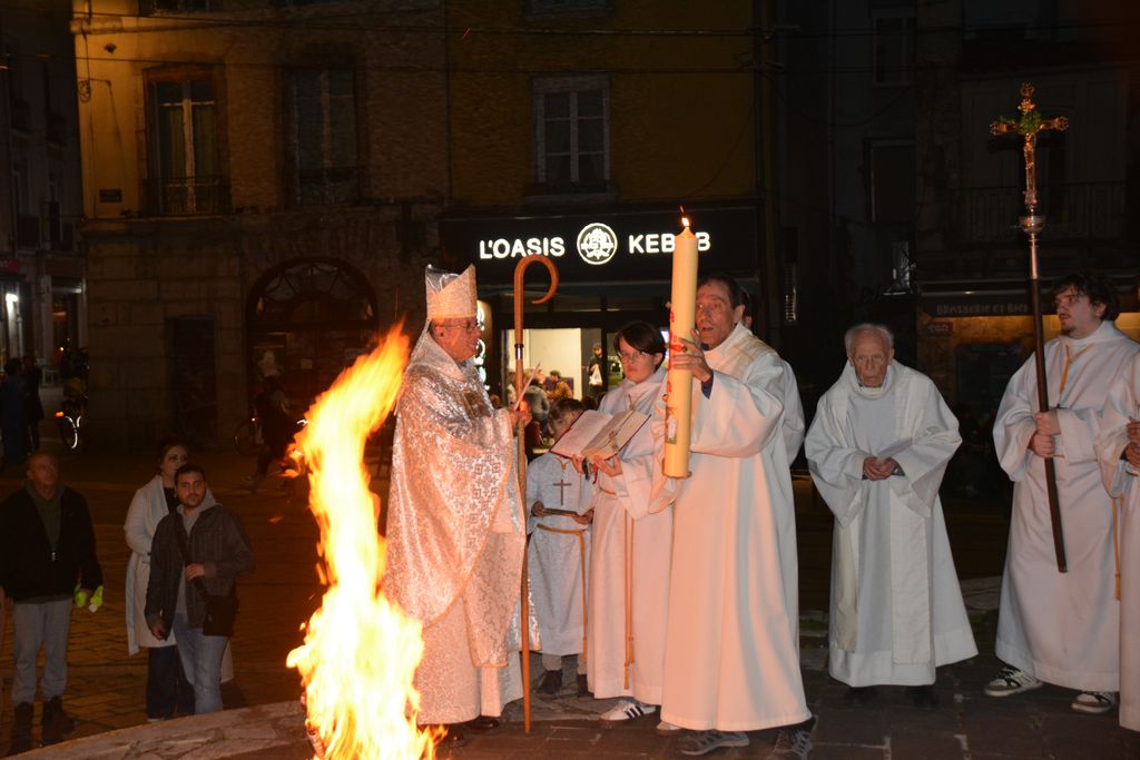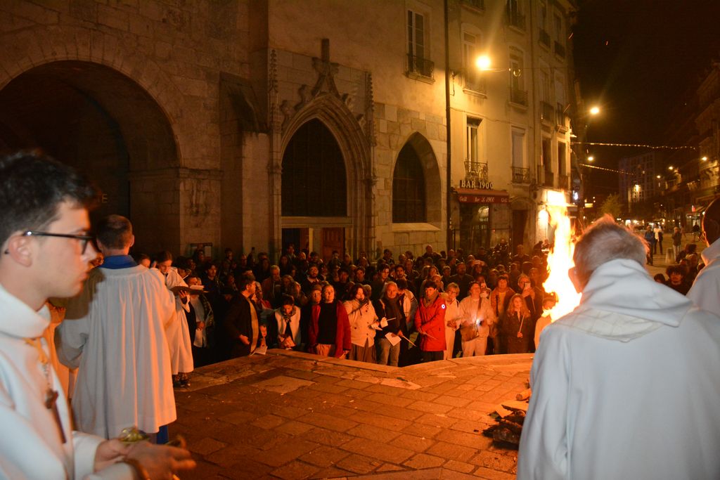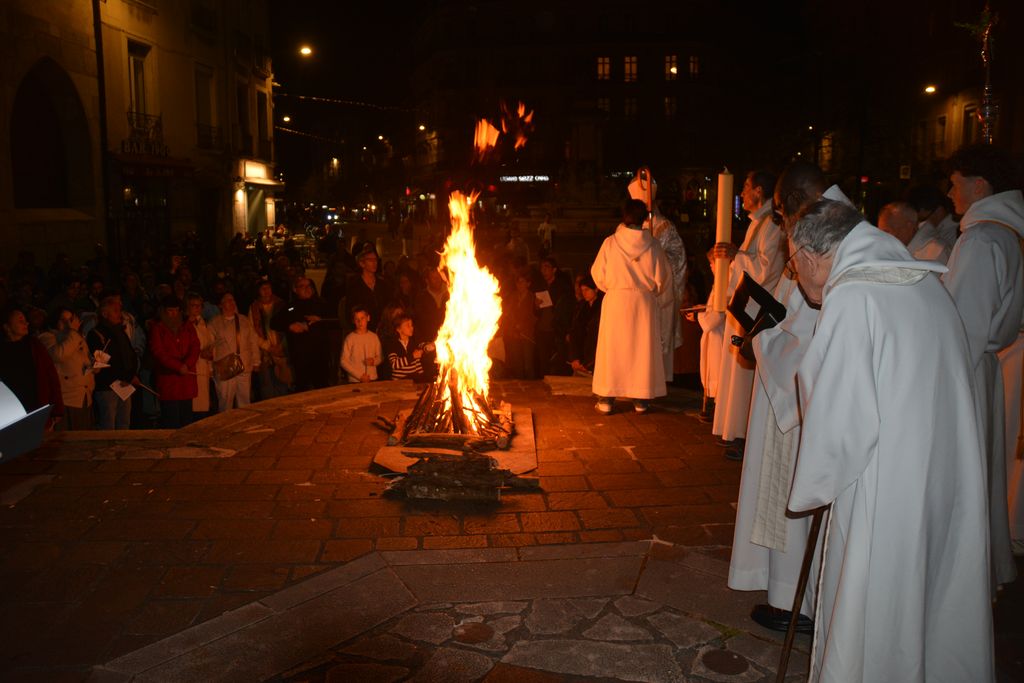 Sur le parvis, l’évêque a béni le feu, symbole de la lumière qui se lève dans la nuit, allumé le cierge pascal, puis nous sommes entrés en procession, pour écouter la proclamation chantée de l’Exultet : « Qu’éclate dans le ciel la joie des anges, Qu’éclate de partout la joie du monde, Qu’éclate dans l’Église la joie des fils de Dieu : La lumière éclaire l’Église, La lumière éclaire la terre, Peuples, chantez ! »