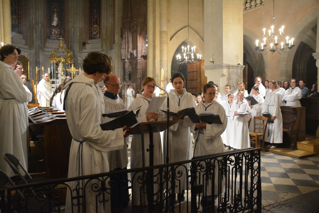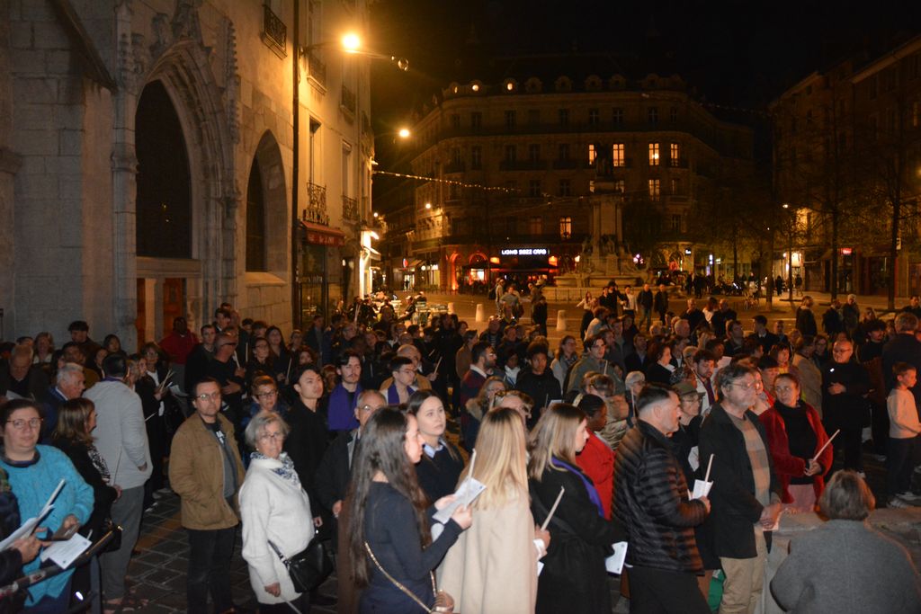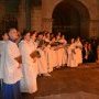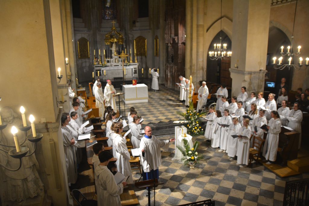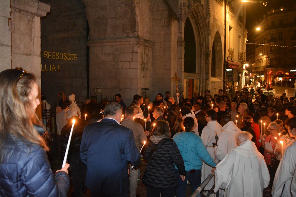 Sur le parvis, l’évêque a béni le feu, symbole de la lumière qui se lève dans la nuit, allumé le cierge pascal, puis nous sommes entrés en procession, pour écouter la proclamation chantée de l’Exultet : « Qu’éclate dans le ciel la joie des anges, Qu’éclate de partout la joie du monde, Qu’éclate dans l’Église la joie des fils de Dieu : La lumière éclaire l’Église, La lumière éclaire la terre, Peuples, chantez ! »