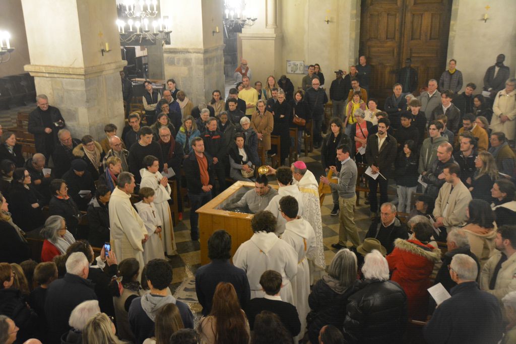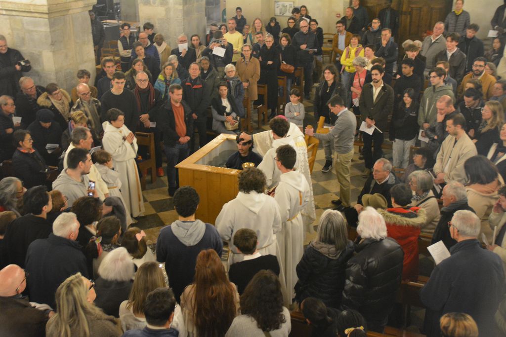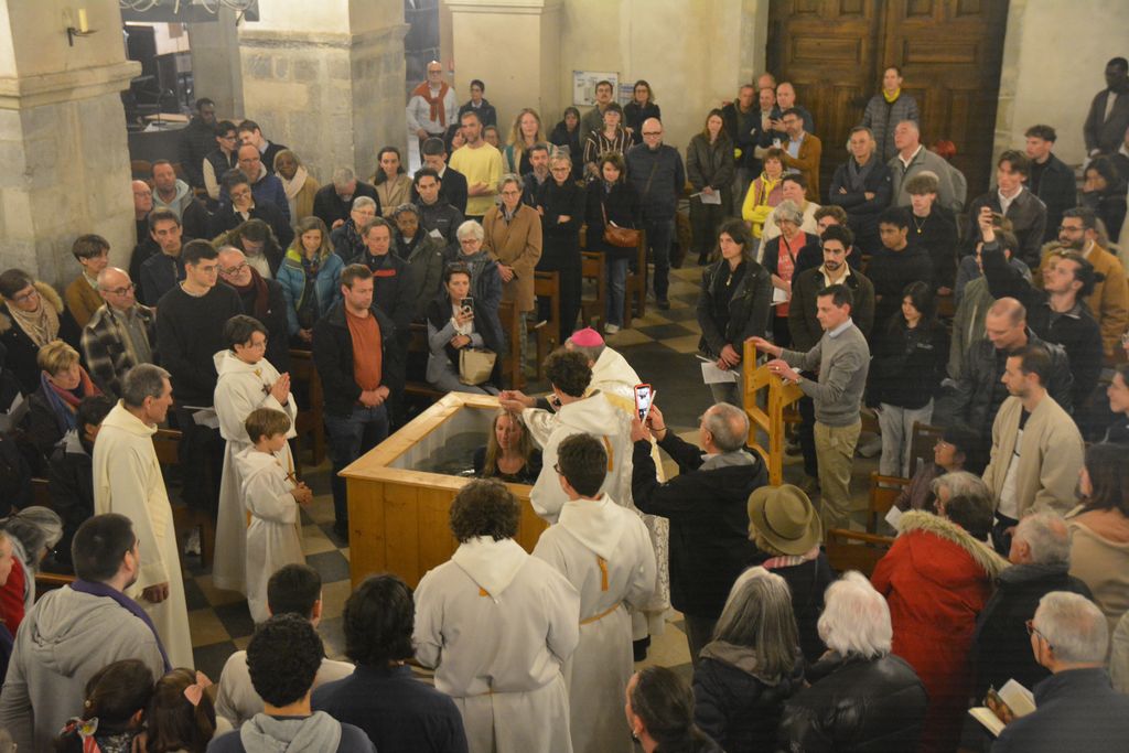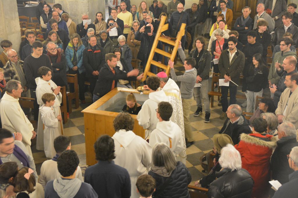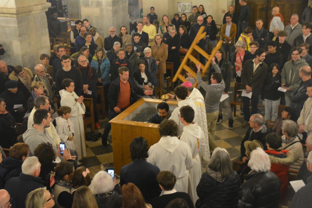 Guidés par la pédagogie liturgique de Mgr Eychenne, nous avons écouté quelques lectures nous rappelant l’histoire du salut. Après une brève homélie, puis la litanie des saints, nous avons tous assistés aux baptêmes de nos chers catéchumènes. L’Église est entrée dans une nouvelle ère, proche de celle des premiers chrétiens, dans laquelle les fidèles ne sont plus baptisés enfants, mais frappent à la porte parce qu’ils cherchent un sens à leur vie.