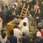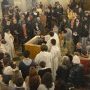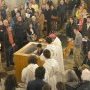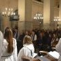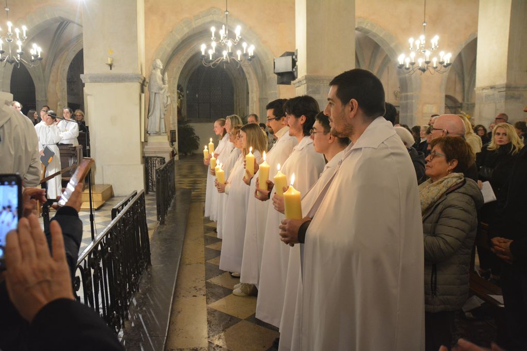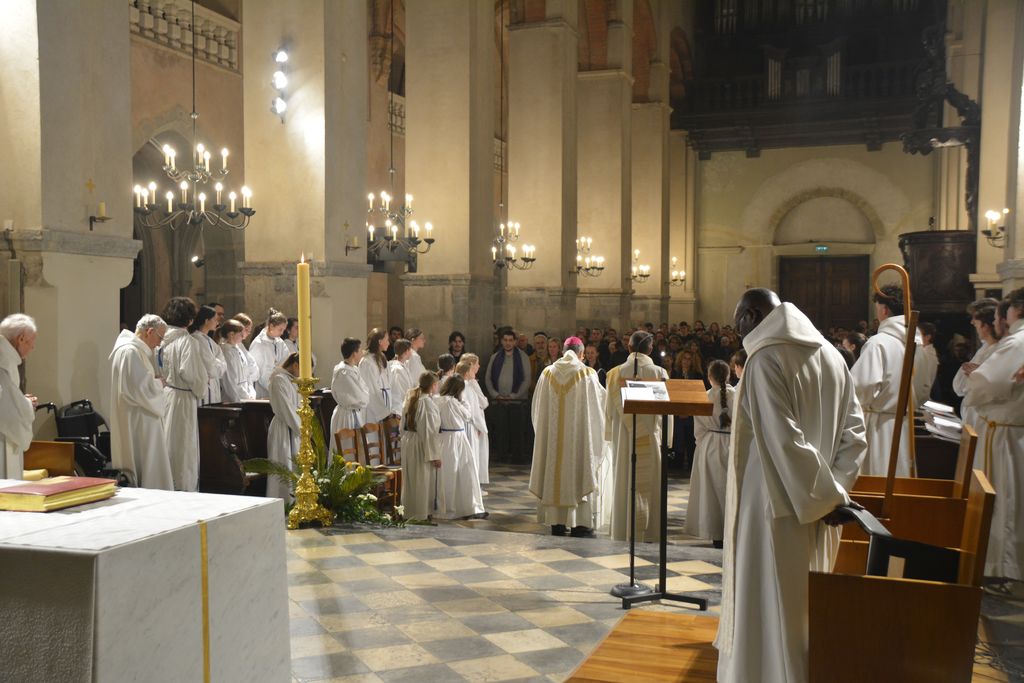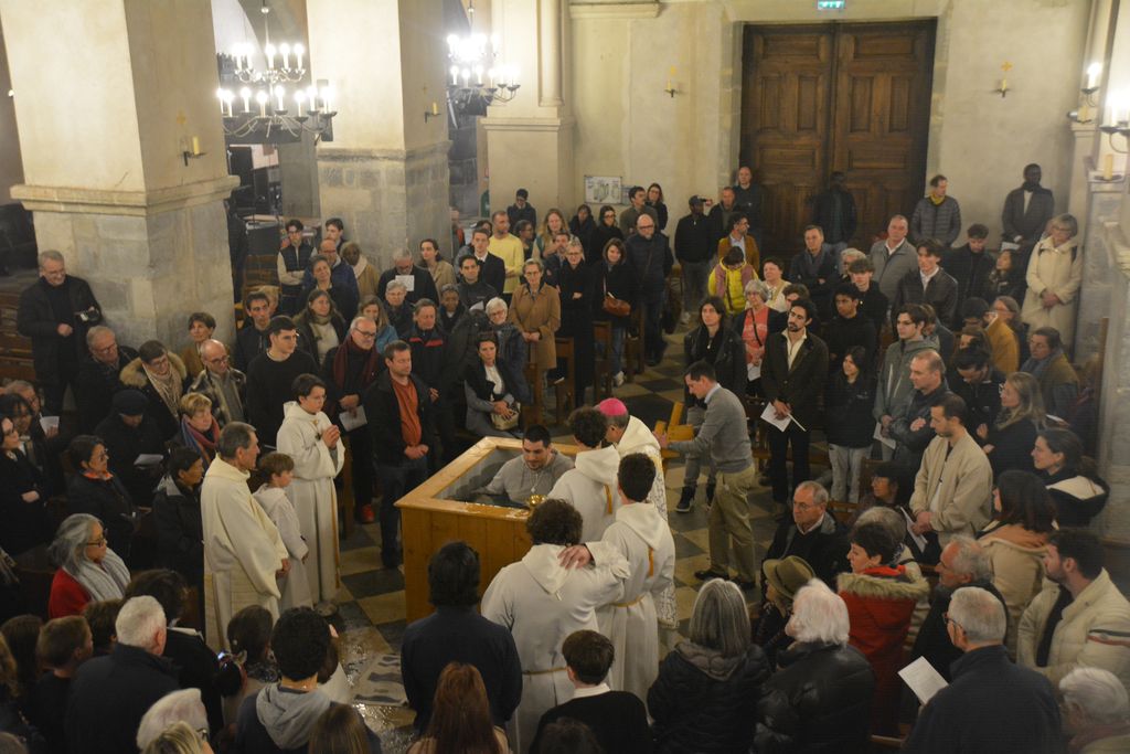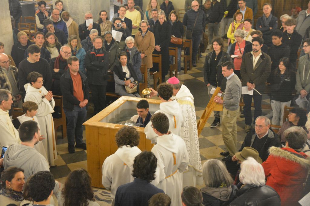 Guidés par la pédagogie liturgique de Mgr Eychenne, nous avons écouté quelques lectures nous rappelant l’histoire du salut. Après une brève homélie, puis la litanie des saints, nous avons tous assistés aux baptêmes de nos chers catéchumènes. L’Église est entrée dans une nouvelle ère, proche de celle des premiers chrétiens, dans laquelle les fidèles ne sont plus baptisés enfants, mais frappent à la porte parce qu’ils cherchent un sens à leur vie.